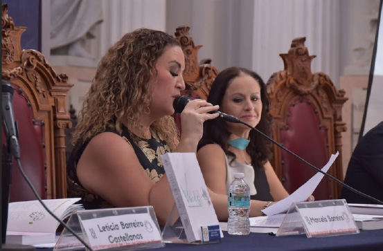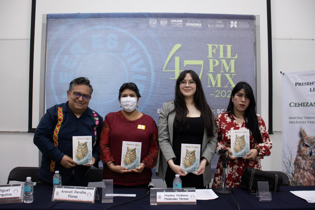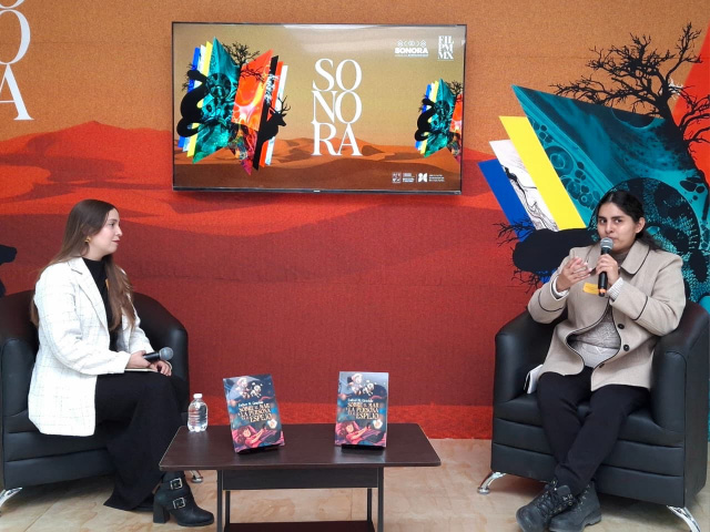 De izquierda a derecha: Grecia Margoth Corrales y Esther M. Gracida en la presentación del libro Sobre el mar y la persona en el espejo en la 47° FIL del Palacio de Minería