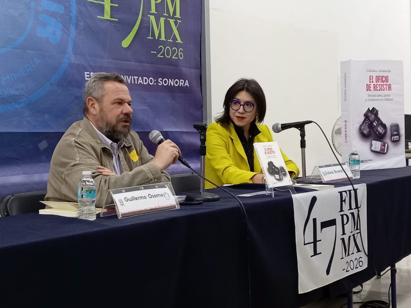 Julieta Brambila y Guillermo Osorno en la presentación del libro El oficio de resistir. Periodismo, poder y violencia en México.