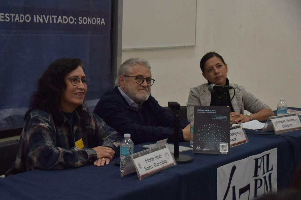 De izquierda a derecha: María Itzel Saínz González, Fausto Rodríguez Manzo y Bárbara Paulina Velarde Gutiérreza en la presentación del libro Diálogo entre saberes. Creatividad y metodología en la 47° FIL del Palacio de Minería