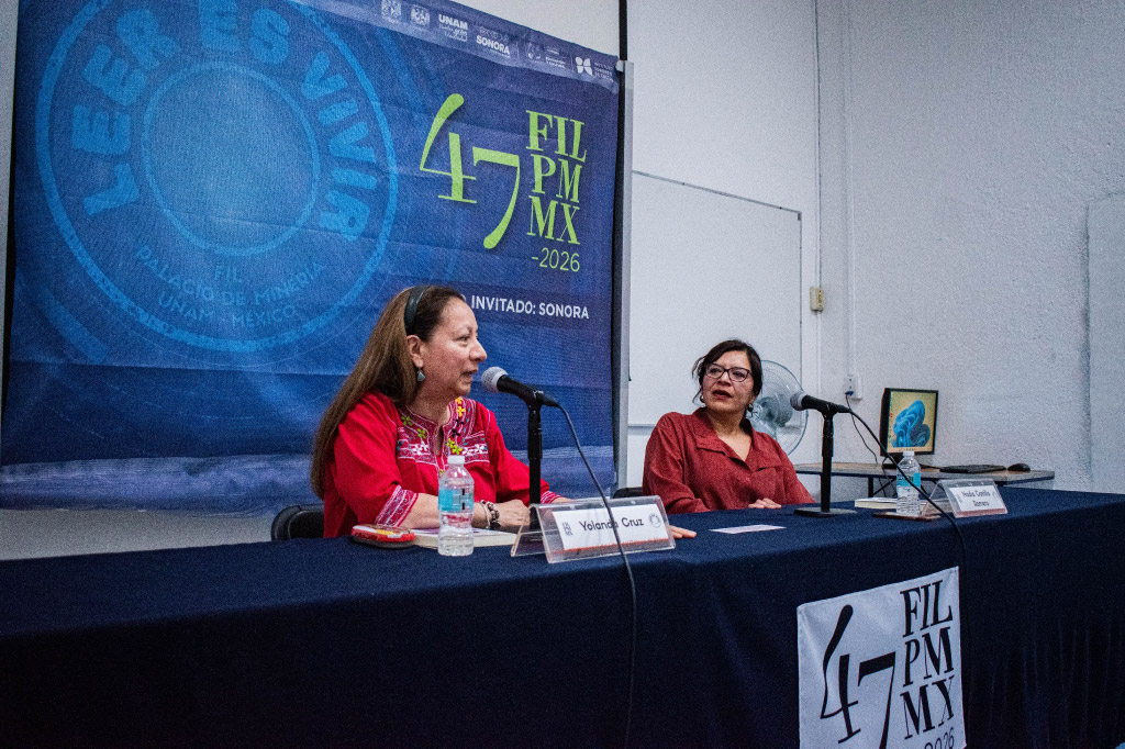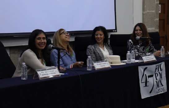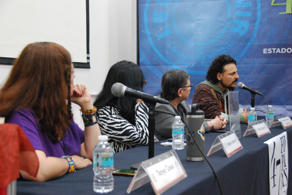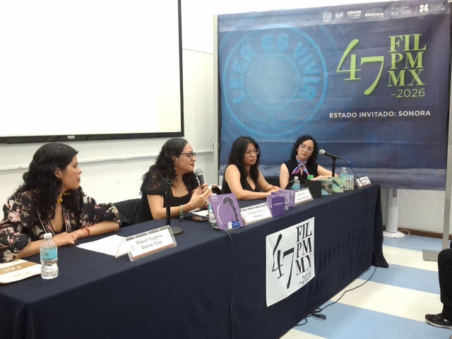 Raquel García Cruz, Laura Michelle Sandoval Martínez, Samantha Viveros Mendoza y la moderadora Daniela Ivette Aguilar durante la presentación del libro