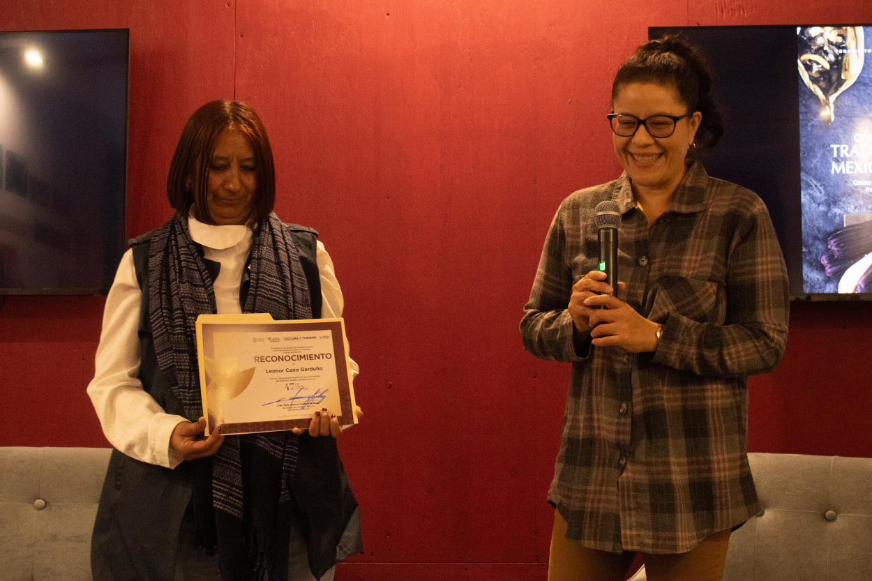 La Mtra. Leonor Cano Garduño recibiendo un reconocimiento de parte de la Secretaría de Cultura y Turismo del Estado de México. Fuentes: Acevedo Ana